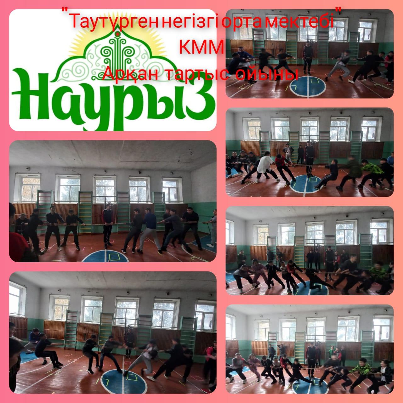 Арқан тартыс ойыны — ұлттық ойын. Ойынды жазда көгалды алаңда, спорт залында өткізуге болады. Ойынға ұзындығы 10 метрдей жуан кендір арқан керек. Ол арқанның тең ортасынан орамалмен орап белгі жасайды, белгінің екі жағынан бір жарым-екі метрдей жерден тағы да жогарыдағы тәртіппен белгілейді. Ойынға қатынасушылар тең екі топқа бөлінеді. Олардың саны 10—12 адам болуы мүмкін, ойыншылар бойларына қарай қатар түзеп тұрады. Дене шынықтыру пәні мұғалімі: Нурбатырова Айгерім