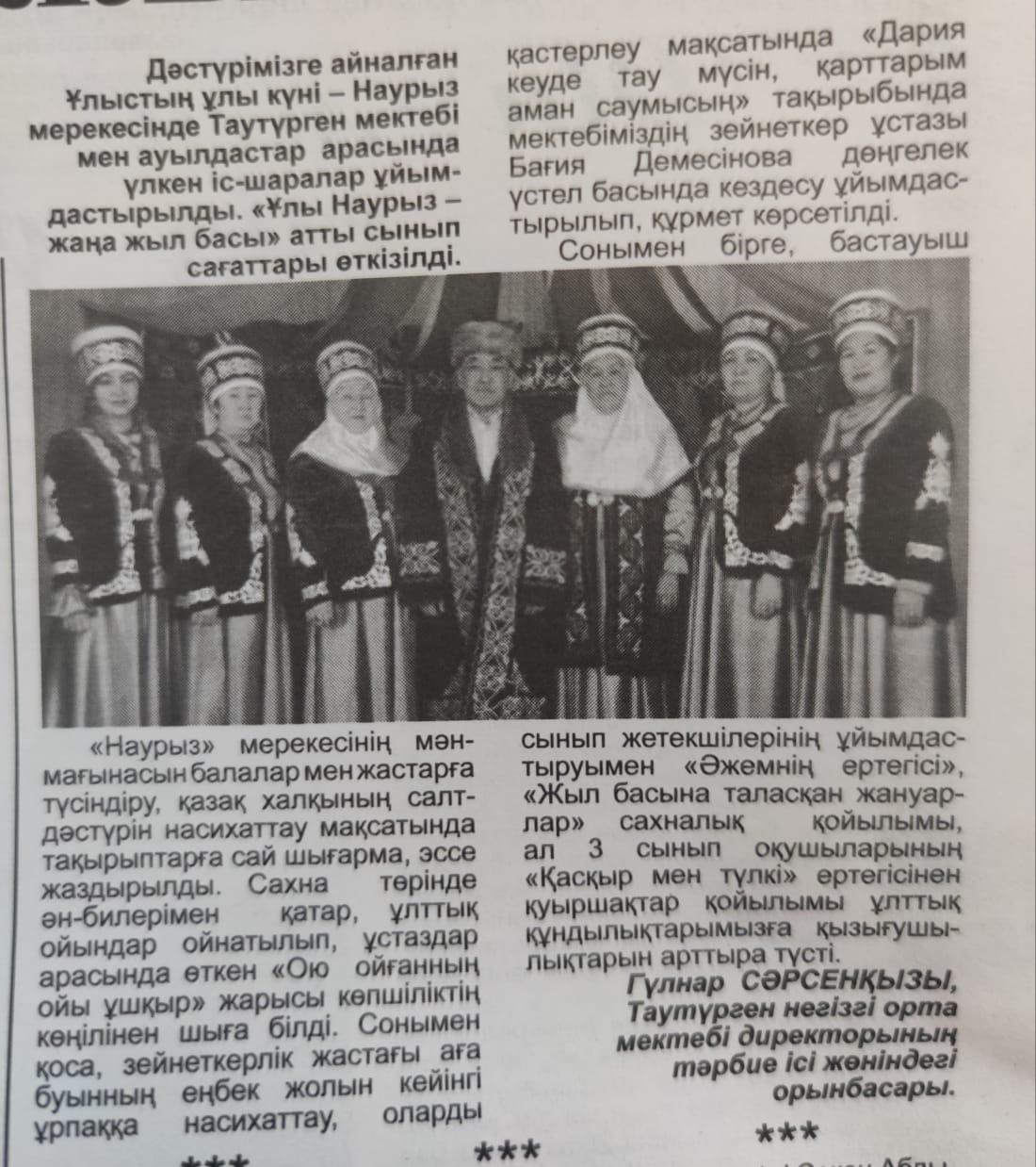 05 апрель 2022 0 1 2 3 4 5 Мұғалімдер "Ұлыстың Ұлы күні-Наурыз" Мектептің іс-шарасын ауданымыздың "Еңбекшіқазақ" газетіне жариялаған ДТІЖО Анаркулова Гульнар Сарсенқызы.